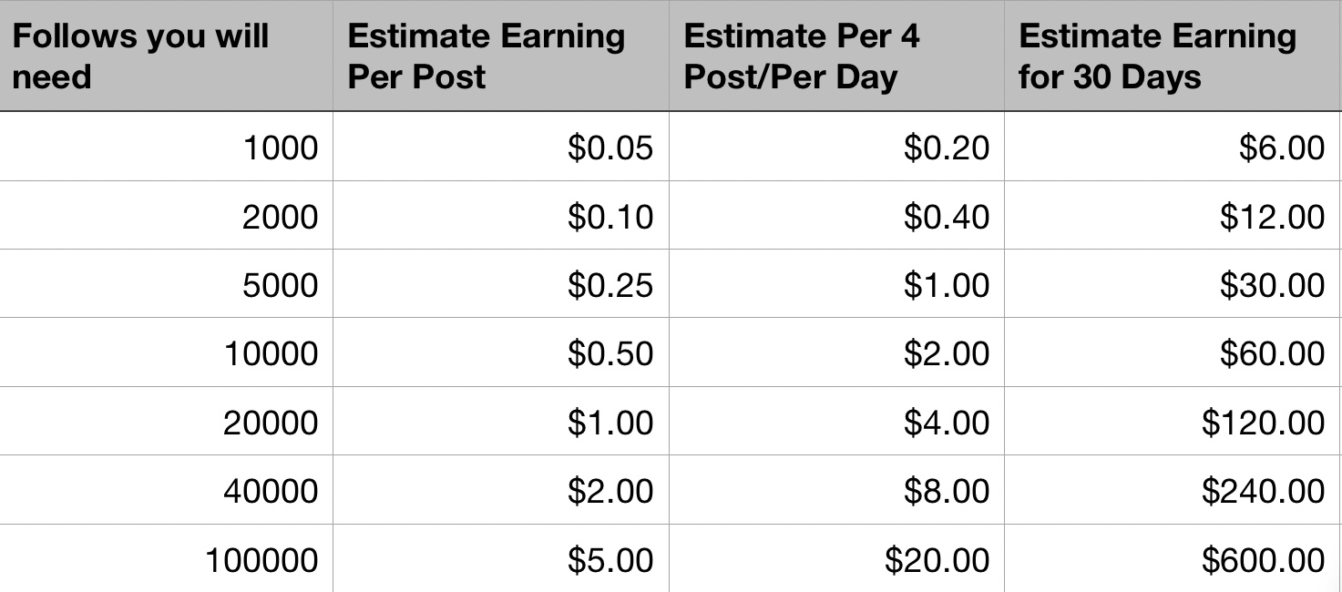 As I mention earlier, you start with nothing but your spare time and your hardwork mainly on how to gain more followers so that you can maximize your earning per post.
